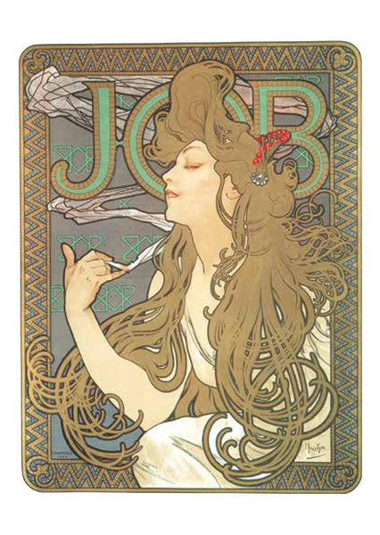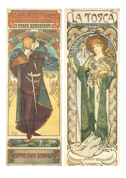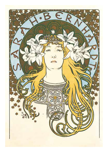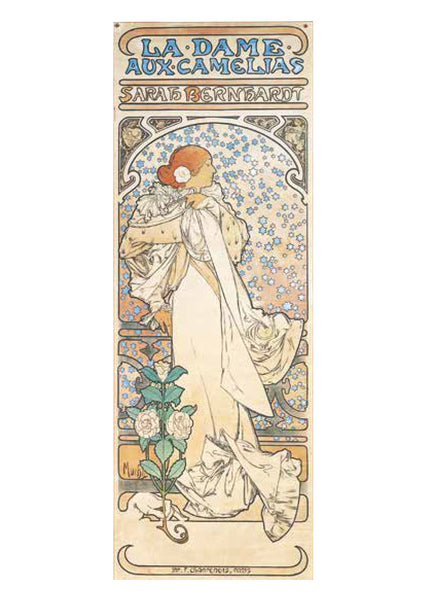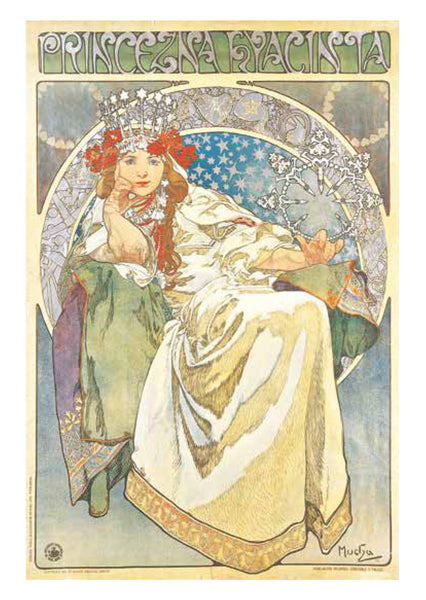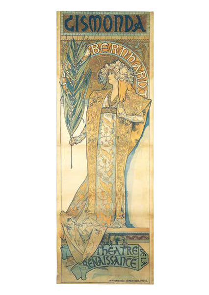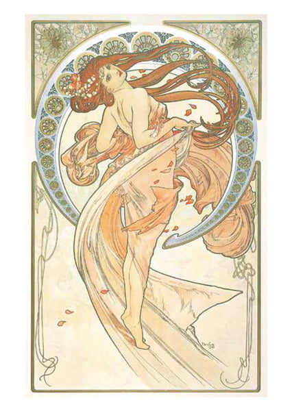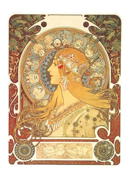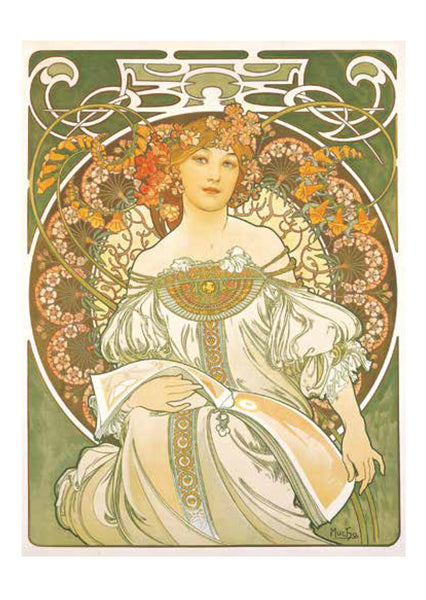 ミュシャは絵画でつちかった的確なデッサンによる女性像を基本に、幾何学文様、様式化された花、髪の毛、衣装などで飾った。